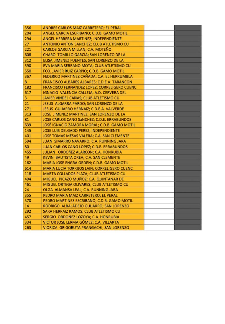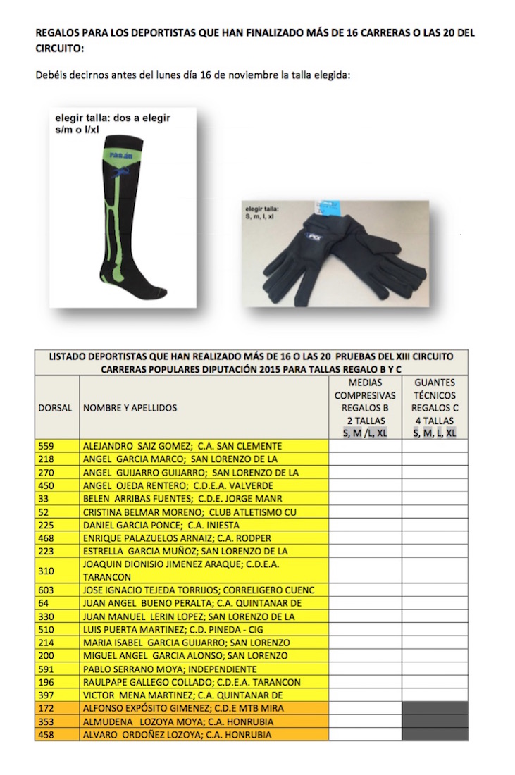 Todos los corredores interesados que aparecen en el listado adjunto, y que hayan completado más de 16 carreras (regalo B, medias) o las 20 del Circuito (regalo B+C: medias y guantes), deben ponerse en contacto con el Servicio de Deportes de la Diputación de Cuenca antes del lunes 16 de noviembre para comunicar la talla que prefieran.